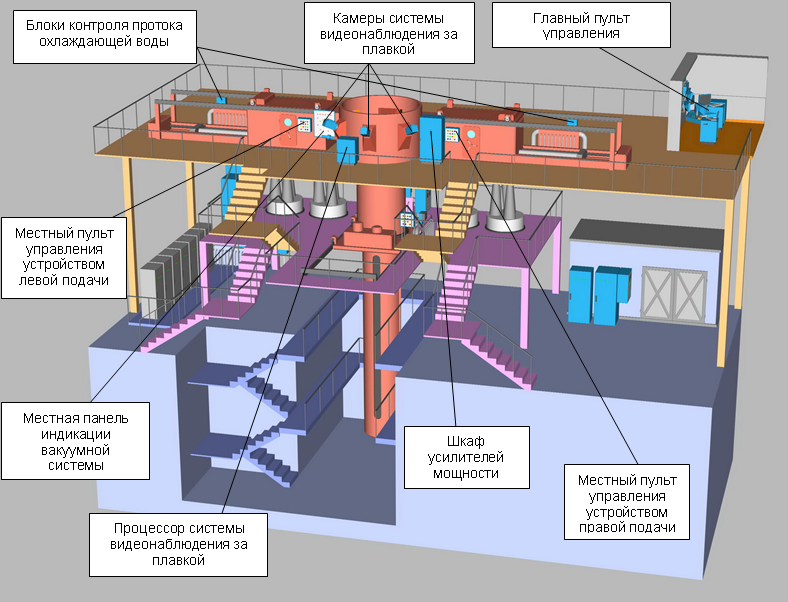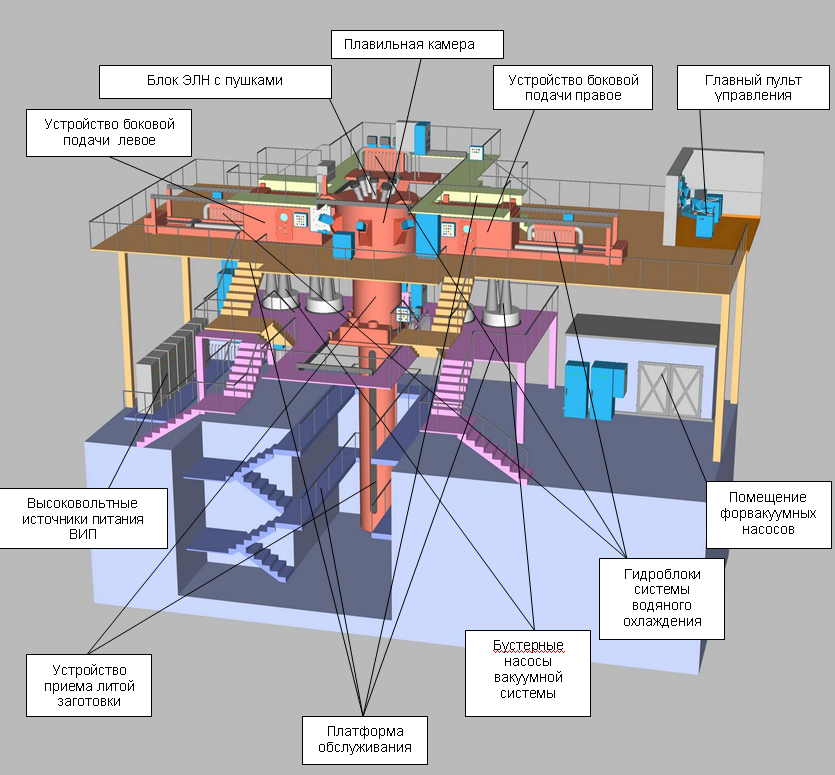 Шихта (4), загруженная в не сплавляемые контейнеры (3) подается с двух сторон в зону плавки, которая осуществляется в плавильной камере в вакууме посредством электронных пучков газоразрядных пушек (6). Управление сканированием пучков позволяет контролировать технологические режимы плавки шихты на торцах заготовок, в промежуточной емкости (2), на сливном носке и в кристаллизаторе (1) и исключает прожоги технологической оснастки. Для исключения попадания брызг расплавленного металла в кристаллизатор установлен экран (5). Сигнал с камер видеонаблюдения (7) транслируется на мониторы главного пульта управления в режиме реального времени, а также автоматически обрабатывается системами ПТКУ. Сигнал с камеры контроля уровня ванны металла в кристаллизаторе (8) позволяет в автоматическом режиме управлять устройством вытягивания слитка (9).