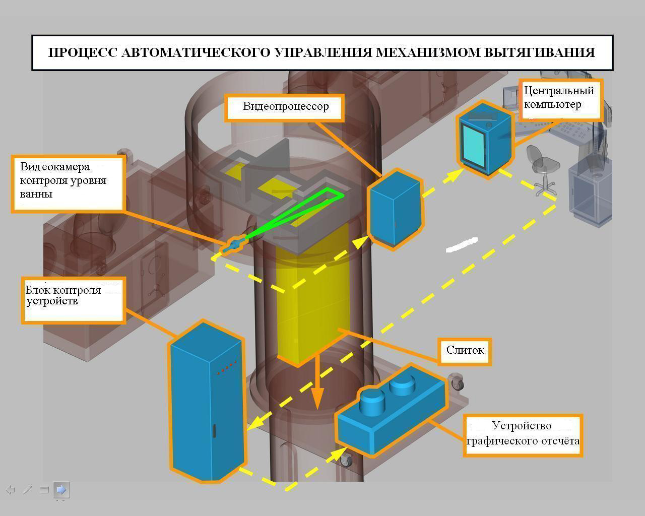 В подсистеме управления устройством вытягивания литой заготовки реализована новая схема автоматического контроля уровня металла в ванне кристаллизатора, когда сигнал с камеры видеоконтроля уровня ванны поступает через видеопроцессор на центральный компьютер, который посредством блока контроля устройств задает требуемый режим работы механизму вытягивания слитка.